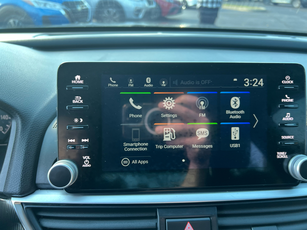 • Radio: 180-Watt AM/FM Audio System -inc: 8 speakers, 8" display audio w/high-resolution electrostatic touch-screen, knobs and hard keys for primary controls and customizable feature settings, Bluetooth HandsFreeLink, Bluetooth streaming audio, SMS text message function, Radio Data System (RDS), Speed-Sensitive Volume Compensation (SVC), HondaLink, Apple CarPlay integration, Android Auto integration, 2 2.5-amp USB smartphone/audio interface ports in front console, 2 2nd-row 2.5-amp USB charging ports, illuminated steering wheel-mounted controls and gloss black fin-type roof-mounted antenna